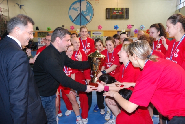 Ο Γενικός Γραμματέας της Ο.Χ.Ε Χαράλαμπος Πιλαφός και ο Δήμαρχος Βύρωνα Νίκος Χαρδαλιάς, δίνουν το τρόπαιο στη νικήτρια ομάδα του FINAL FOUR "Ορμή Λουξ Πατρών".