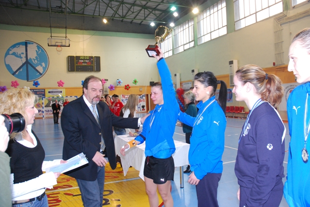 Ο Αντιπρόεδρος της Ο.Χ.Ε Παντελής Χατζηιωάννου και η Πρόεδρος του Αθλητικού Οργανισμού Μαρία Βυρίνη, βραβεύουν τη φιναλίστ ομάδα της Νέας Ιωνίας.