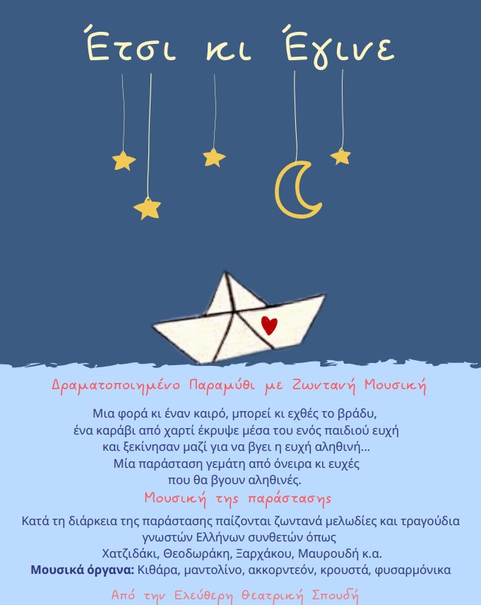 Με έμπνευση την ευχή ενός παιδιού, ένα μικρό καραβάκι ταξίδεψε όλα τα παιδιά στον κόσμο των ονείρων, της χαράς, της πίστης, της υπομονής, της αλήθειας. Την παράσταση πλαισίωσαν ζωντανά, μελωδίες και αγαπημένα τραγούδια γνωστών Ελλήνων συνθετών όπως των Χατζιδάκι, Θεοδωράκη, Ξαρχάκου, Μαυρουδή, με την συνοδεία κιθάρας, ακορντεόν, κρουστών και φυσαρμόνικας.