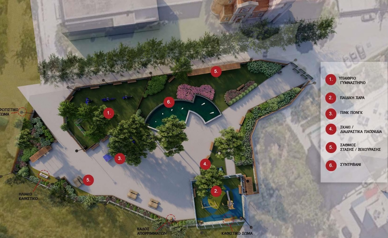 Δημιουργείται υπαίθριο γυμναστήριο αλλά και χώροι αναψυχής και ψυχαγωγίας, πέργκολα σκίασης ενώ θα υπάρχουν και αρκετοί χώροι παιγνιδιού με τραπέζι αντισφαίρισης, σκάκι και άλλα διαδραστικά παιχνίδια.