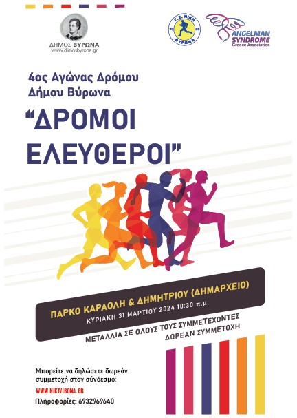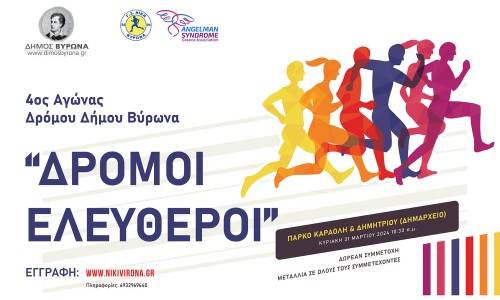 Για 4η φορά ο Δήμος Βύρωνα, σε συνεργασία με τον Γυμναστικό Σύλλογο Νίκη Βύρωνα, διοργανώνει την Κυριακή 31 Μαρτίου 2024 τον αγώνα “ΔΡΟΜΟΙ ΕΛΕΥΘΕΡΟΙ”.