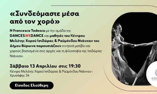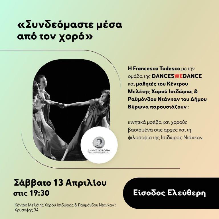 Το Σάββατο 13 Απριλίου στις 19:30, μαθητές του Κέντρου Μελέτης Χορού Ι. & Ρ. Ντάνκαν του Δήμου Βύρωνα και μέλη της ομάδας «Dances We Dance» της Francesca Todesco, θα παρουσιάσουν στη μεγάλη αίθουσα του Ντάνκαν (Χρυσάφης 34 & Δικαιάρχου) κινητικά μοτίβα και χορούς βασισμένα στις αρχές και τη φιλοσοφία της Ισιδώρας Ντάνκαν.