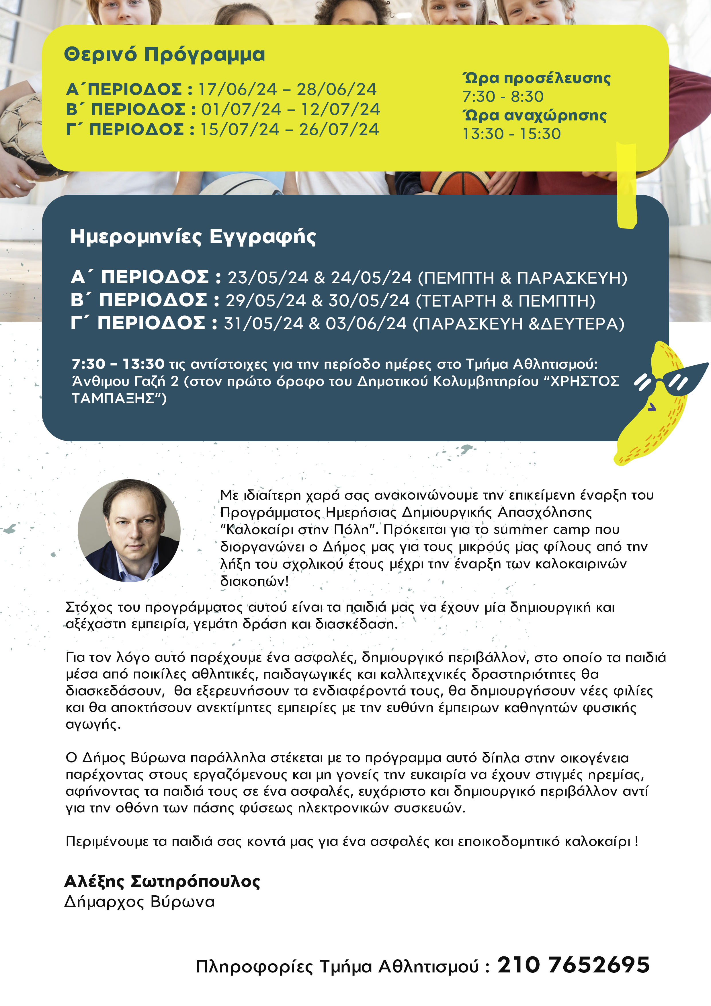 Ο Δήμος Βύρωνα παράλληλα στέκεται με το πρόγραμμα αυτό δίπλα στην οικογένεια παρέχοντας στους εργαζόμενους και μη γονείς την ευκαιρία να έχουν στιγμές ηρεμίας, αφήνοντας τα παιδιά τους σε ένα ασφαλές, ευχάριστο και δημιουργικό περιβάλλον αντί για την οθόνη των πάσης φύσεως ηλεκτρονικών συσκευών.