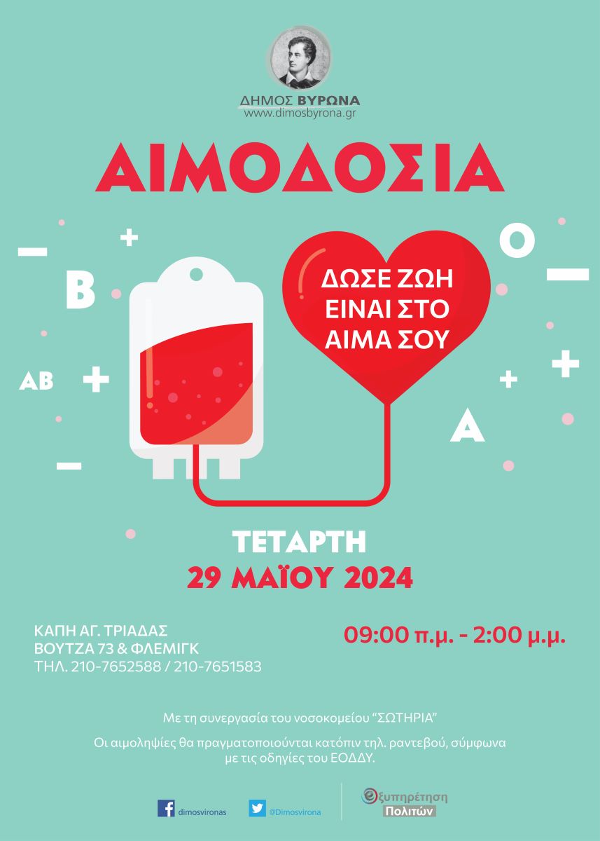 Εθελοντική Αιμοδοσία του Δήμου Βύρωνα την Τετάρτη 29 Μαΐου 2024