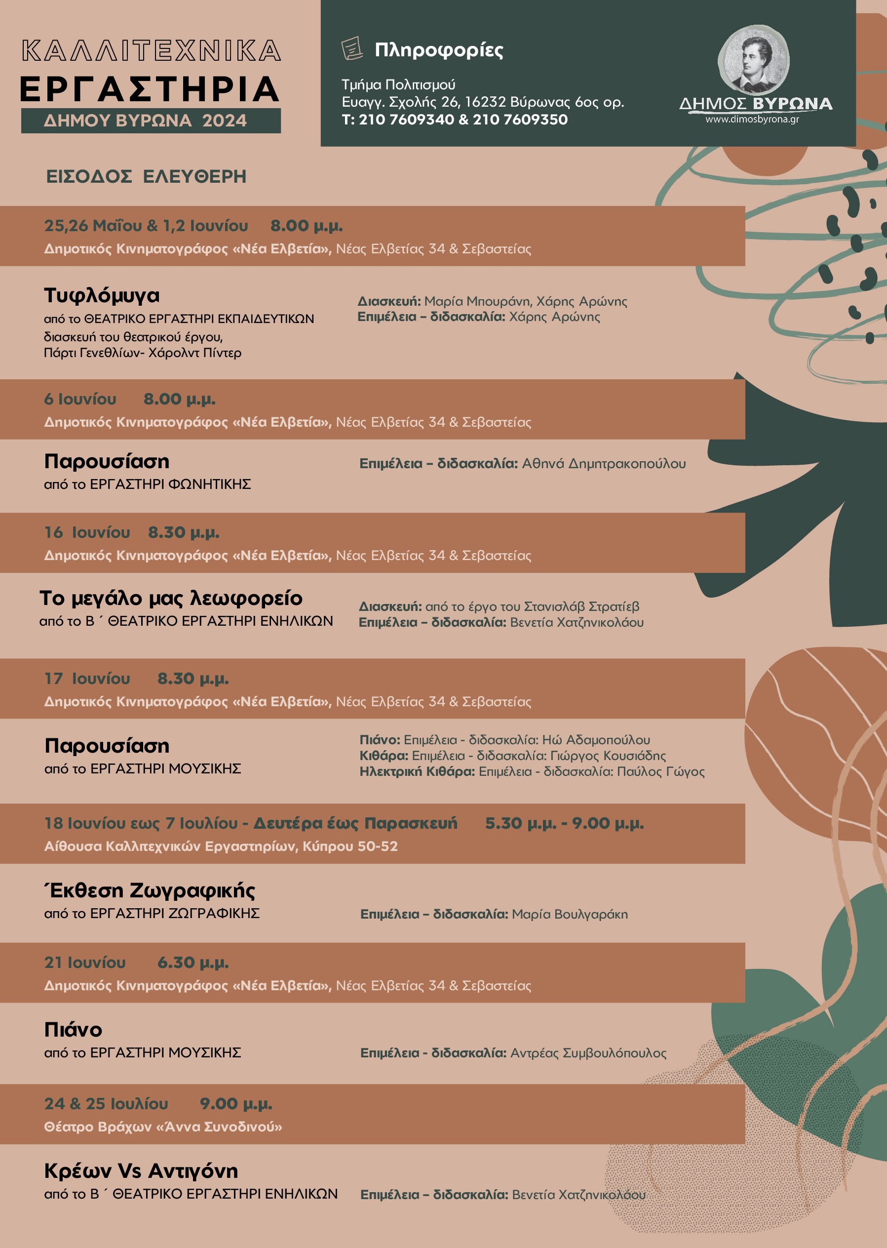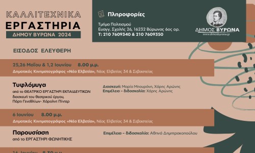 Το πρόγραμμα των εκδηλώσεων των Καλλιτεχνικών Εργαστηρίων Βύρωνα / 25 Μαίου - 25 Ιουλίου 2024