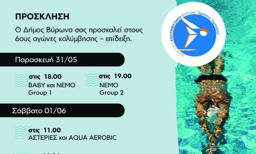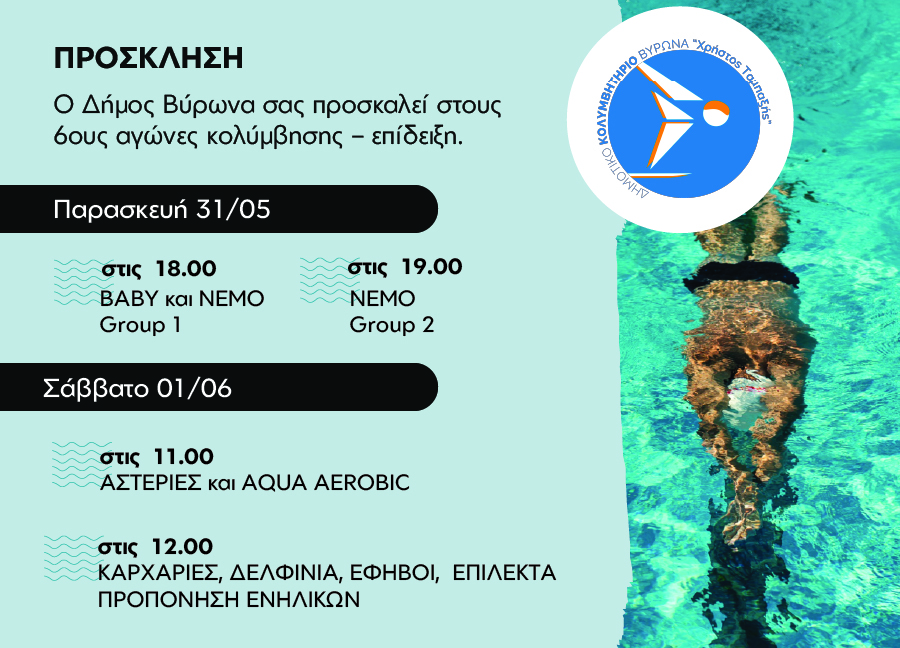 Ο Δήμος Βύρωνα και το Τμήμα Δημοτικού Κολυμβητηρίου σας προσκαλεί με χαρά στους 6ους αγώνες κολύμβησης – επίδειξη.