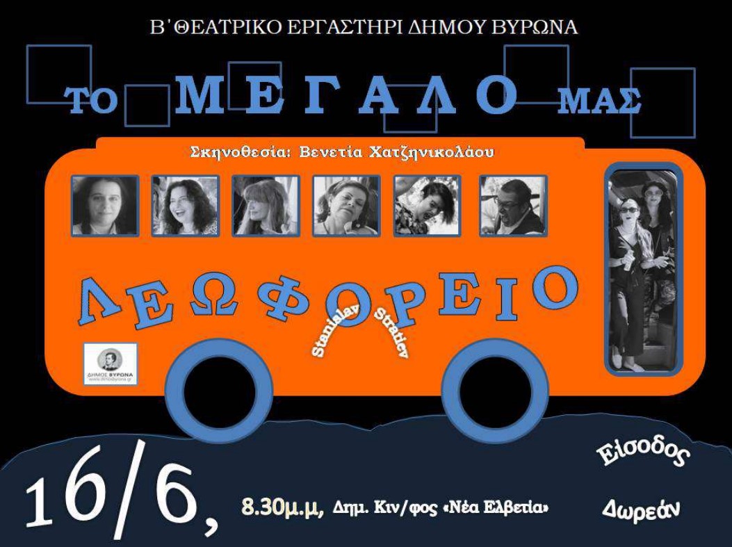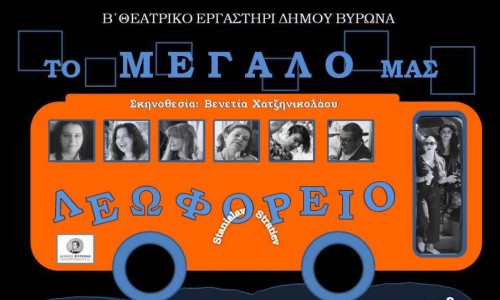 Το Β’ Θεατρικό Eργαστήρι του Δήμου Βύρωνα παρουσιάζει την αλληγορική κωμωδία «Το μεγάλο μας λεωφορείο». Πρόκειται για διασκευή του θεατρικού έργου «Το λεωφορείο», του πολυβραβευμένου συγγραφέα Stanislav Stratiev.