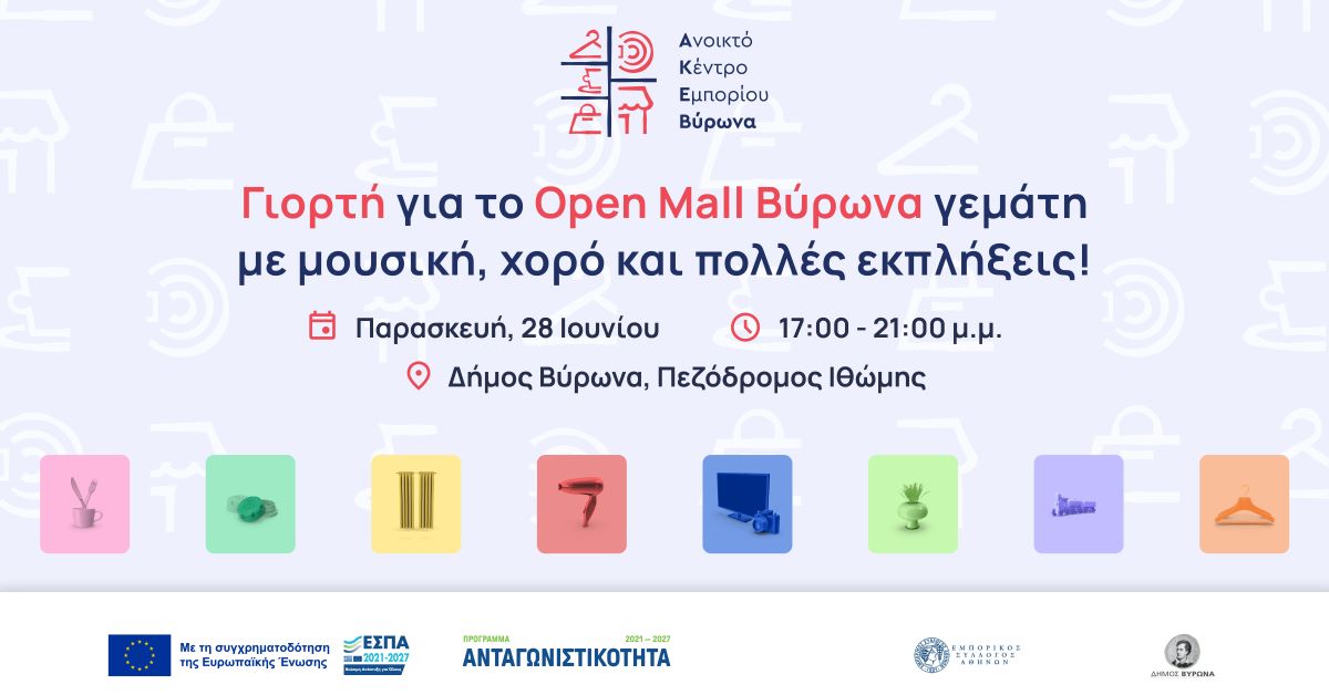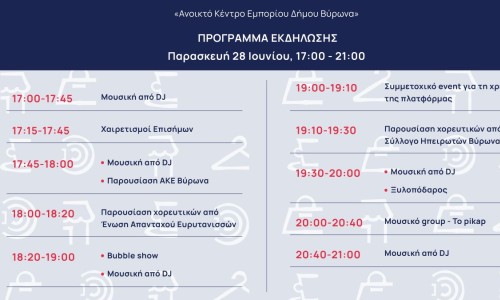 Ο Δήμος Βύρωνα και ο Εμπορικός Σύλλογος Αθηνών σας προσκαλούν την Παρασκευή 28 Ιουνίου 2024 στον Πεζόδρομο της οδού Ιθώμης του Δήμου μας και ώρα 17:00, σε μία σειρά από εκδηλώσεις και πολιτιστικά δρώμενα τα οποία θα πραγματοποιηθούν στο πλαίσιο προώθησης και υλοποίησης του Ανοιχτού Κέντρου Εμπορίου Βύρωνα.