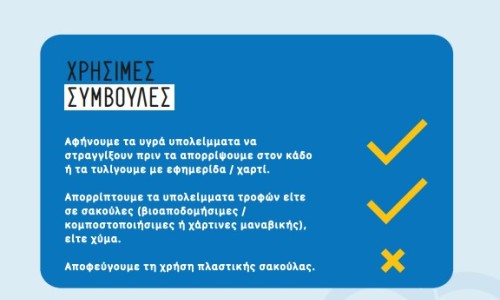 · Απορρίπτουμε τα υπολείμματα τροφών είτε σε σακούλες (βιοαποδομήσιμες/ κομποστοποιήσιμες ή χάρτινες μαναβικής) είτε χύμα.