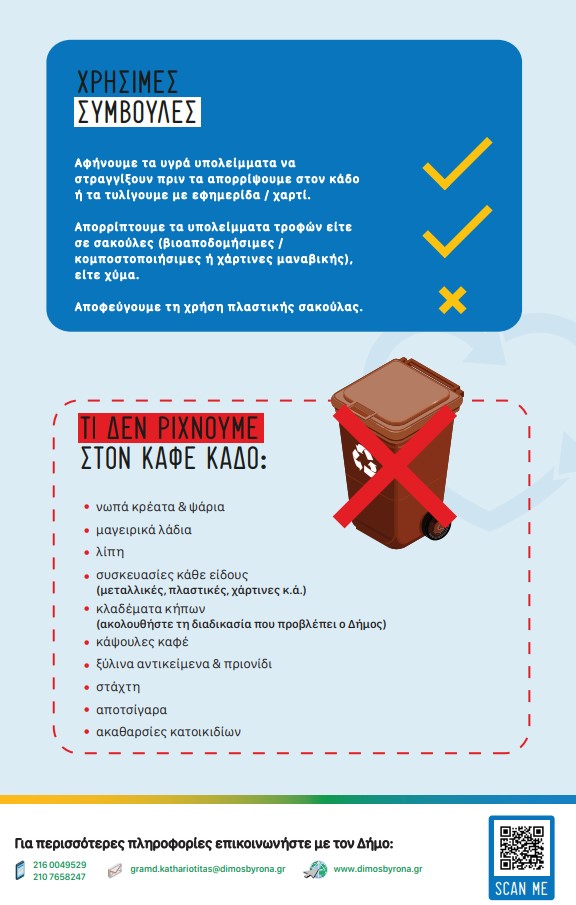 Ο Δήμος Βύρωνα σε συνεργασία με εξειδικευμένους συνεργάτες της Περιφέρειας Αττικής και του ΕΔΣΝΑ (Ειδικός Διαβαθμιδικός Σύνδεσμος Νομού Αττικής), ενημέρωσαν τους κατοίκους της περιοχής για την ορθή χρήση του καφέ κάδου και τα οφέλη της ανακύκλωσης. Στο πλαίσιο της δράσης διανεμήθηκε και δωρεάν δείγμα εδαφοβελτιωτικού υλικού.