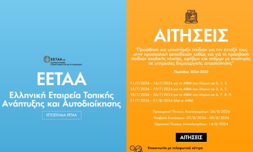 Η ΕΕΤΑΑ ανακοίνωσε την πρόσκληση για τους γονείς που ενδιαφέρονται να εγγράψουν τα παιδιά τους σε Βρεφικούς-Παιδικούς Σταθμούς μέσω του προγράμματος ΕΣΠΑ «Προώθηση και υποστήριξη παιδιών για την ένταξή τους στην προσχολική εκπαίδευση καθώς και για την πρόσβαση παιδιών σχολικής ηλικίας, εφήβων και ατόμων με αναπηρία, σε υπηρεσίες δημιουργικής απασχόλησης», προκειμένου να καταθέσουν τις αιτήσεις τους για την απόκτηση voucher.