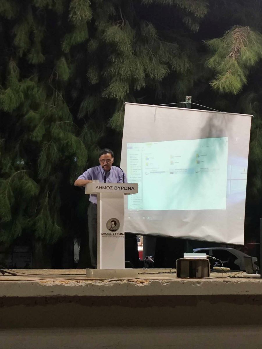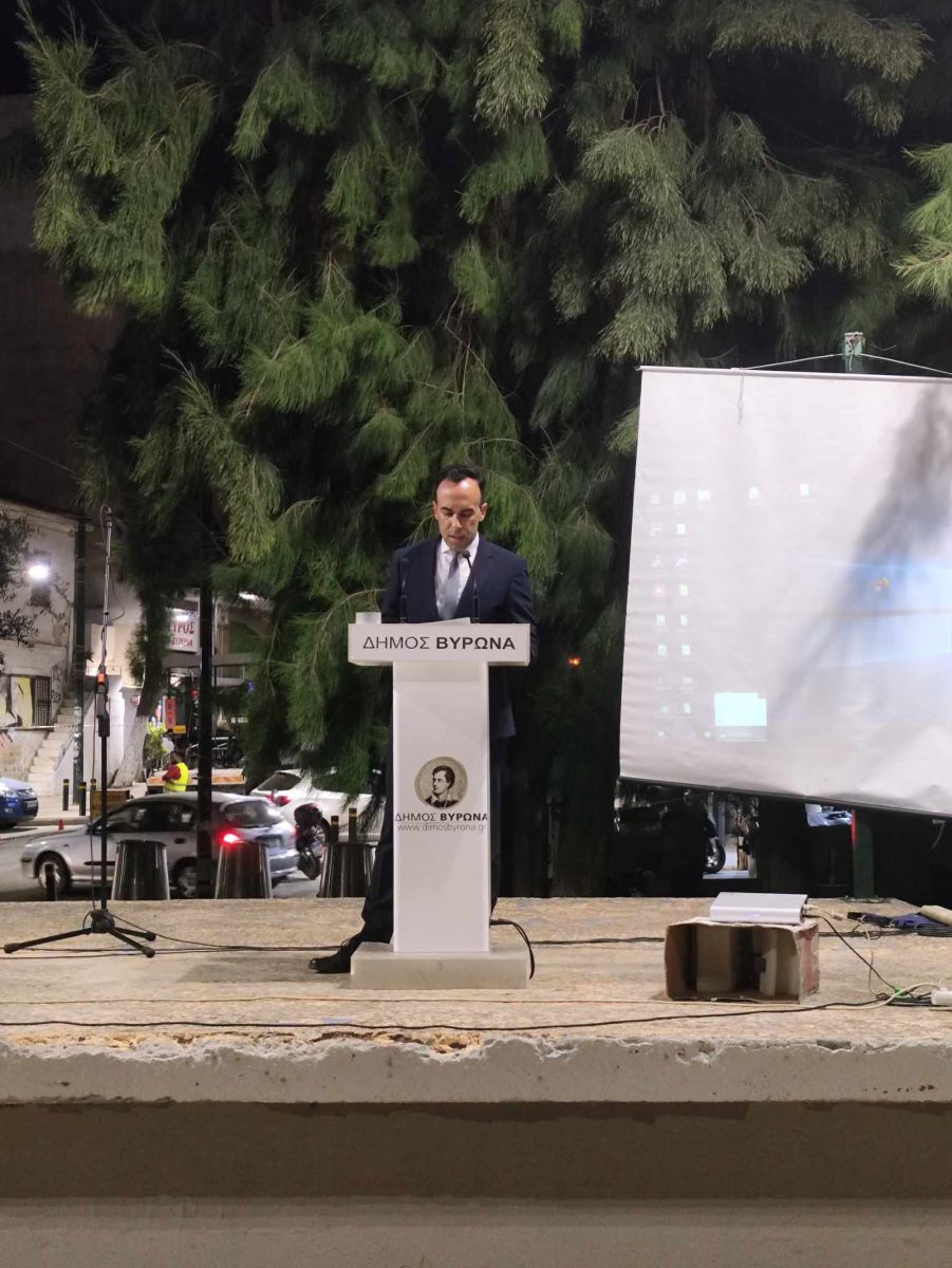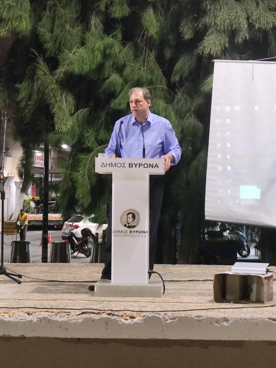 Ο Δήμαρχος Βύρωνα Αλέξης Σωτηρόπουλος στον χαιρετισμό του στην εκδήλωση ανέφερε -μεταξύ άλλων ότι - «Βρισκόμαστε εδώ απόψε, μισό αιώνα από την τραγωδία στην Κύπρο, για να στείλουμε ένα ηχηρό μήνυμα ότι δεν ξεχνάμε την βάρβαρη τουρκική εισβολή και την παράνομη κατοχή του 38% της Κύπρου, ότι δεν ξεχνάμε και τιμούμε τους ηρωικά πεσόντες για την υπεράσπιση της μεγαλονήσου, ότι δεν ξεχνάμε τους αγνοούμενους και τις χιλιάδες οικογένειες που έχασαν τις πατρογονικές τους εστίες, εκτοπιζόμενοι βίαια απ’ αυτές, δεν ξεχνάμε τους φόνους, τα βασανιστήρια, τους βιασμούς, την παραβίαση των ανθρωπίνων δικαιωμάτων και τη σύληση ελληνικών πολιτιστικών και χριστιανικών μνημείων και συνεχίζουμε να διεκδικούμε μία δίκαιη και βιώσιμη λύση στην βάση των ψηφισμάτων της Γενικής Συνέλευσης του ΟΗΕ και τους διεθνούς δικαίου. Δεν δεχόμαστε και δεν συμβιβαζόμαστε με την κατοχή, δεν πρόκειται ποτέ να αναγνωρίσουμε παράνομα τετελεσμένα, τον βίαιο συστηματικό εποικισμό και τη διχοτόμηση, αλλά θα συνεχίσουμε μέχρι να δικαιωθούμε για τον αγώνα για μία Κύπρο ενιαία και ελεύθερη. Ο Βύρωνας μία πόλη που γεννήθηκε μέσα από τις στάχτες μίας εθνικής καταστροφής γνωρίζει πολύ καλά τι σημαίνει προσφυγιά. Ήδη έχω επικοινωνήσει με τον Δήμο Αμμοχώστου και έχω ζητήσει να εξετάσουμε το ενδεχόμενο αδελφοποίησης των δύο πόλεων.»