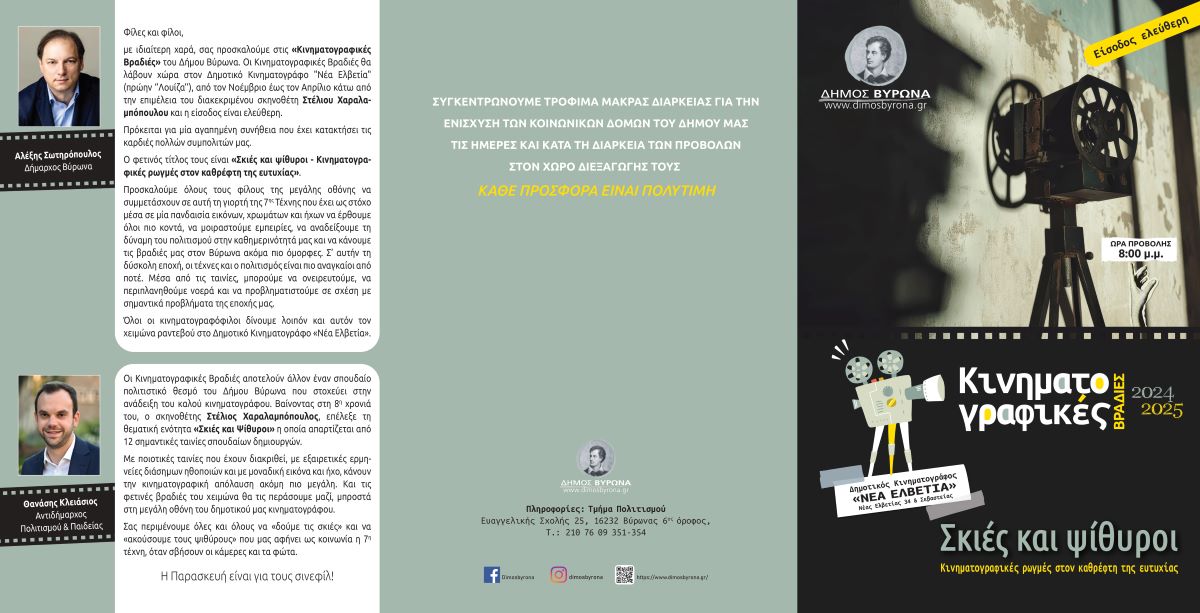 με ιδιαίτερη χαρά, σας προσκαλούμε στις «Κινηματογραφικές Βραδιές» του Δήμου Βύρωνα. Οι Κινηματογραφικές Βραδιές θα λάβουν χώρα στον Δημοτικό Κινηματογράφο "Νέα Ελβετία" (πρώην ‘’Λουίζα’’), από τον Νοέμβριο έως τον Απρίλιο κάτω από την επιμέλεια του διακεκριμένου σκηνοθέτη Στέλιου Χαραλαμπόπουλου και η είσοδος είναι ελεύθερη.