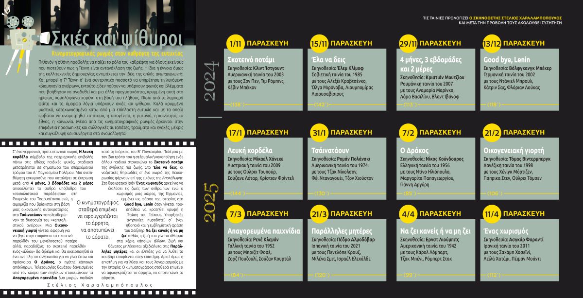 Σας περιμένουμε όλες και όλους να «δούμε τις σκιές» και να «ακούσουμε τους ψιθύρους» που μας αφήνει ως κοινωνία η 7η τέχνη, όταν σβήσουν οι κάμερες και τα φώτα.