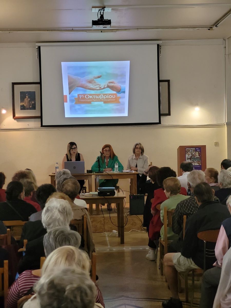 Ακολούθησαν οι ομιλίες της Βασιλικής Παναγιωτακοπούλου, Επισκέπτριας Υγείας του Τμήματος Προστασίας & Προαγωγής Υγείας, και της Βασιλικής Κομπογιάννη, Κοινωνικής Λειτουργού της Τ.Ο.Μ.Υ. Καρέα. Οι ομιλήτριες ανέδειξαν την ανεκτίμητη συνεισφορά των ηλικιωμένων σε πολλούς τομείς της κοινωνικής και οικογενειακής ζωής, καθώς και τα δικαιώματα και τις υποχρεώσεις τους.