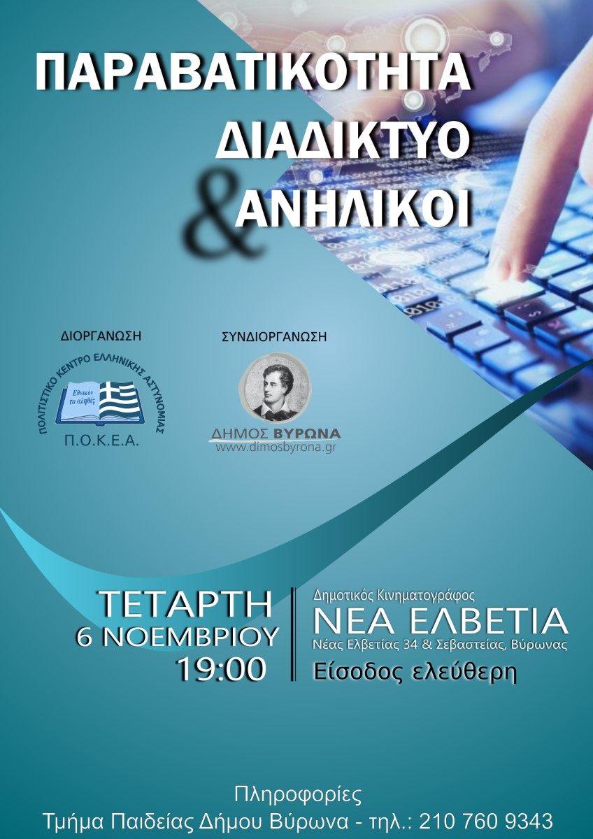 Το Πολιτιστικό Κέντρο Ελληνικής Αστυνομίας σε συνεργασία με τον Δήμο Βύρωνα συνδιοργανώνουν ημερίδα με θέμα: Παραβατικότητα – Διαδίκτυο & Ανήλικοι