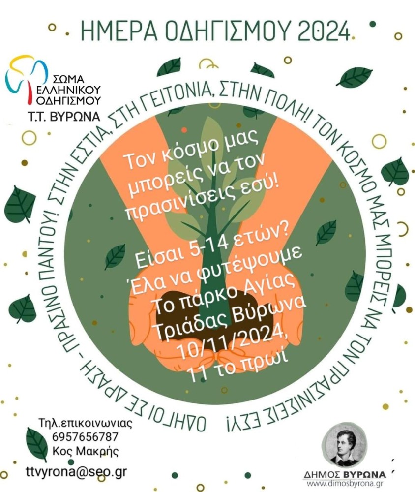 Οι Οδηγοί γιορτάζουν την Ημέρα Οδηγισμού και προσκαλούν τους μικρούς φίλους ηλικίας 5-14 ετών στην δενδροφύτευση που θα γίνει στο πάρκο της Αγίας Τριάδας Βύρωνα την Κυριακή 10/11/2024 και ώρα 11:00 το πρωί.