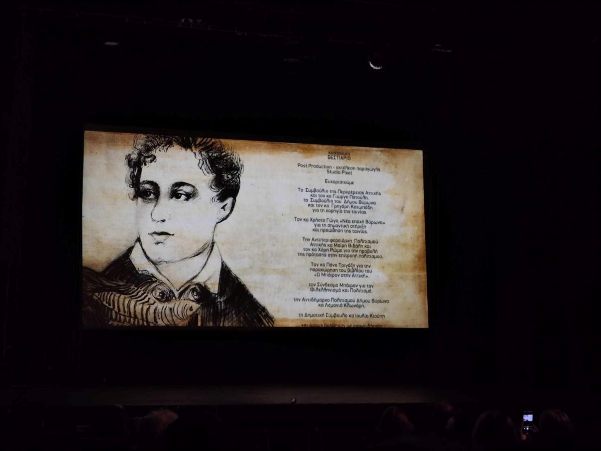 Ο Δήμος Βύρωνα ολοκληρώνοντας τις ετήσιες πολιτιστικές εκδηλώσεις τιμής και μνήμης για τα 200 χρόνια από τον θάνατο του μεγάλου φιλέλληνα ποιητή Λόρδου Βύρωνα, που φέρει τιμητικά το όνομα του, παρουσίασε το βραβευμένο ιστορικό ντοκιμαντέρ «Ο Byron στην Αττική» την Δευτέρα 18 Νοεμβρίου στον Δημοτικό Κινηματογράφο «Νέα Ελβετία».