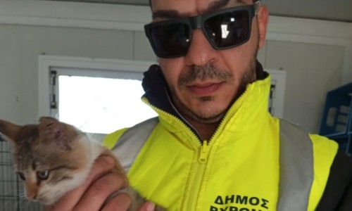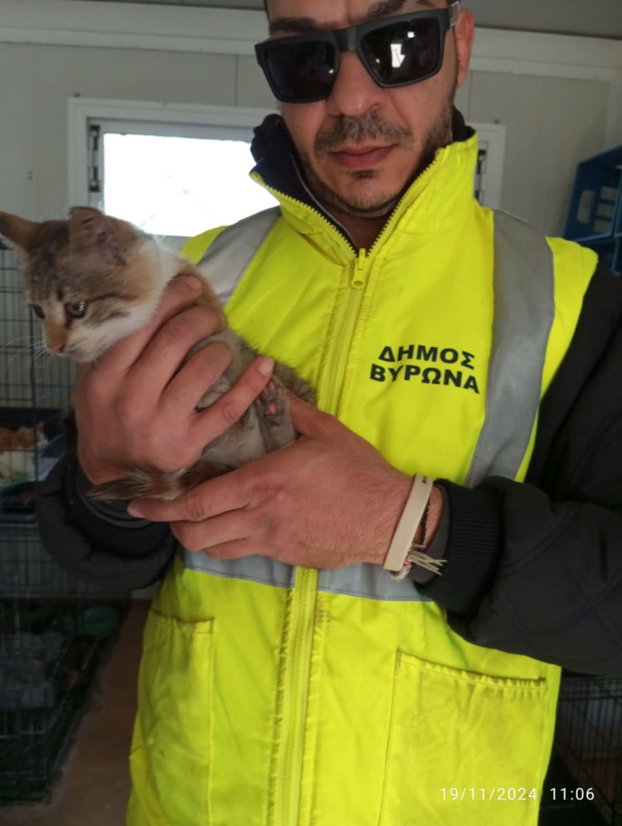 Η Μαθήτρια του Γυμνασίου της Ανάληψης ζήτησε τη βοήθεια της υπηρεσίας Αστικής Πανίδας του Δήμου Βύρωνα, για ένα γατάκι που έκλαιγε το βράδυ, κάτω από ένα αυτοκίνητο. Πήγαμε στο στο σημείο και με γατοπαγίδα καταφέραμε και το πιάσαμε και τώρα δέχεται τη φροντίδα μας στη Δομή Βραχείας Φιλοξενίας της Υπηρεσίας μας.