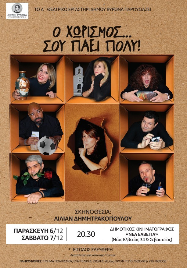 Την Παρασκευή 6 Δεκεμβρίου και το Σάββατο 7 Δεκεμβρίου 2024, στις 20.30 στο Δημοτικό Κινηματογράφο “Νέα Ελβετία” το Α΄Θεατρικό Εργαστήρι του Δήμου Βύρωνα θα παρουσιάσει την κωμωδία “Ο Χωρισμός ….σου πάει πολύ” σε σκηνοθεσία Λίλιαν Δημητρακοπούλου.
