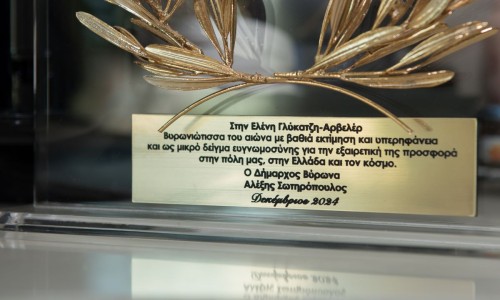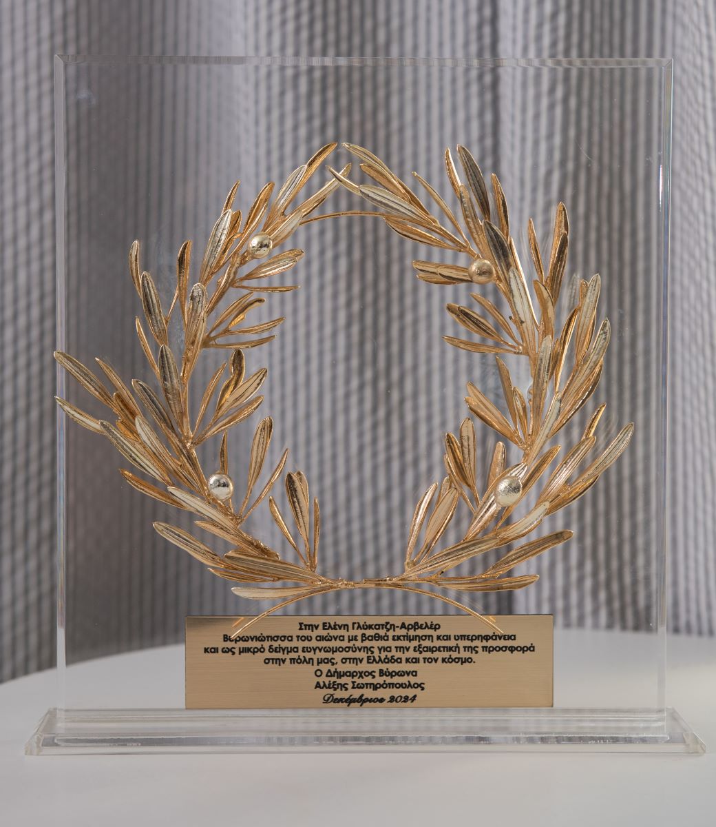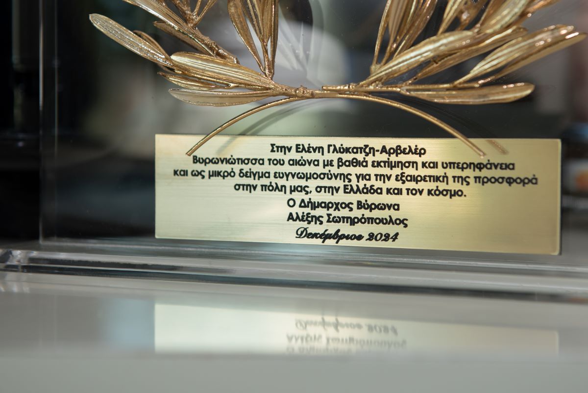 Στη συνάντηση αυτή, ο Δήμαρχος Βύρωνα απένειμε στην κ. Γλύκατζη-Αρβελέρ αναμνηστική πλακέτα, ως ένδειξη ευγνωμοσύνης και τιμής για την εξαιρετική προσφορά της στην πόλη του Βύρωνα, την Ελλάδα και τον κόσμο.