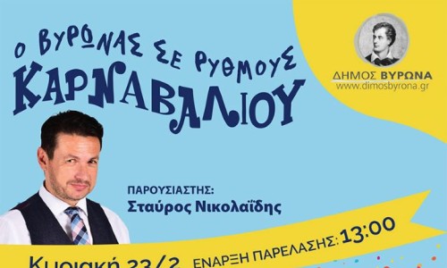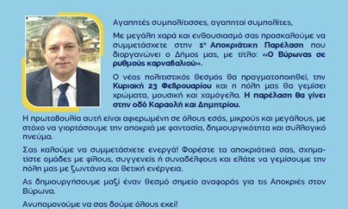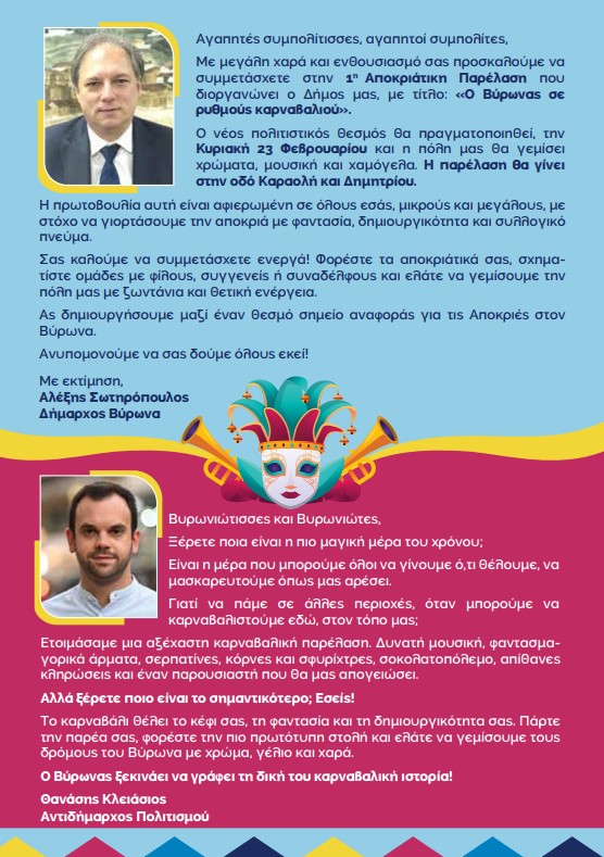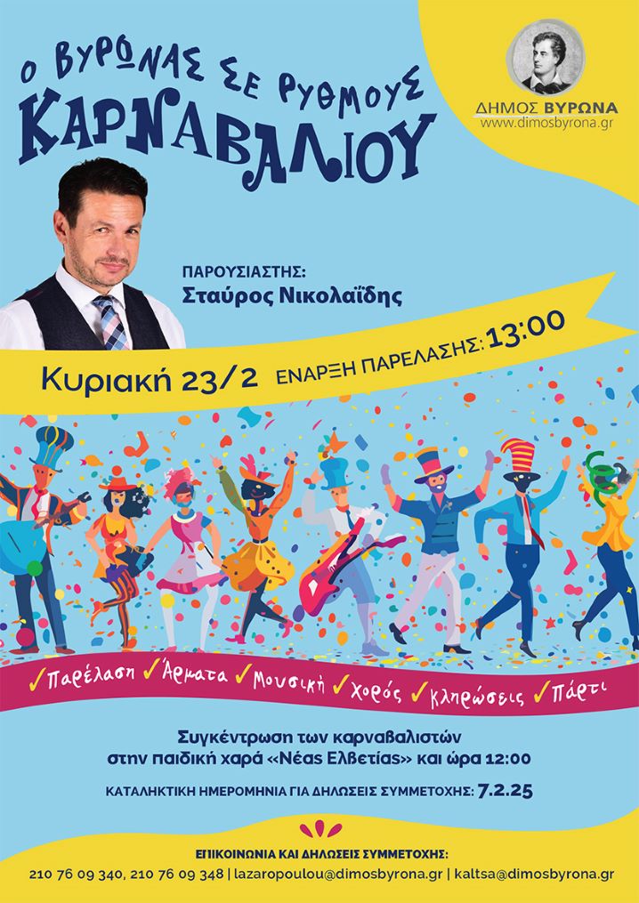 Με ιδιαίτερη χαρά σας ενημερώνουμε ότι ο Δήμος Βύρωνα διοργανώνει την 1η αποκριάτικη παρέλαση με τίτλο "Ο Βύρωνας σε ρυθμούς καρναβαλιού", την Κυριακή 23 Φεβρουαρίου 2025, με τόπο συγκέντρωσης την παιδική χαρά «Νέας Ελβετίας» στις 12:00 και ώρα έναρξης της παρέλασης 1:00 μ.μ.