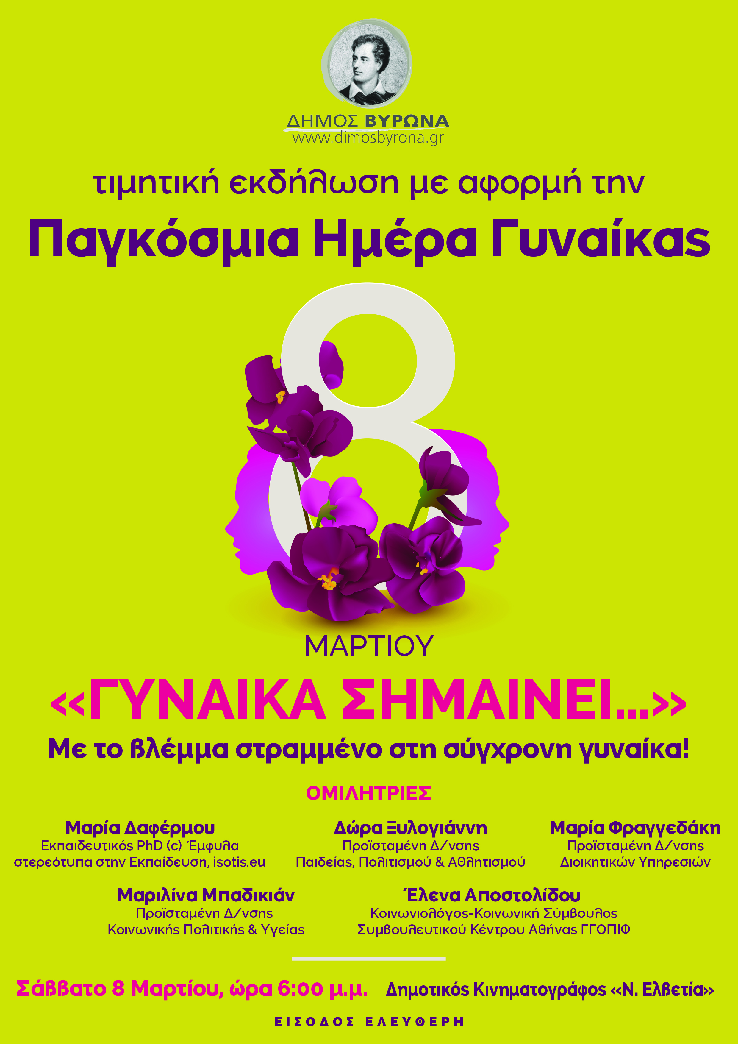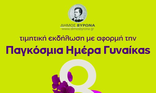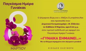 Παγκόσμια Ημέρα Γυναίκας: Ο Δήμος Βύρωνα τιμά τη γυναίκα σε εκδήλωση με τίτλο: « ΓΥΝΑΙΚΑ ΣΗΜΑΙΝΕΙ… Με το βλέμμα στραμμένο στη σύγχρονη γυναίκα!», Σάββατο 8 Μαρτίου, ώρα 6:00 μ.μ., Κινηματογράφο "Νέα Ελβετία"