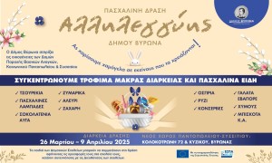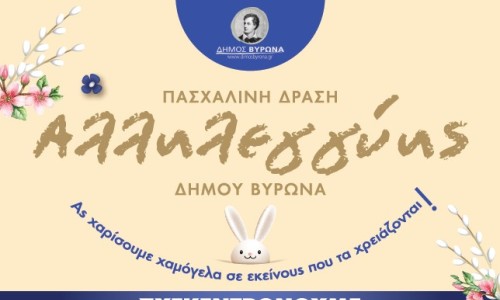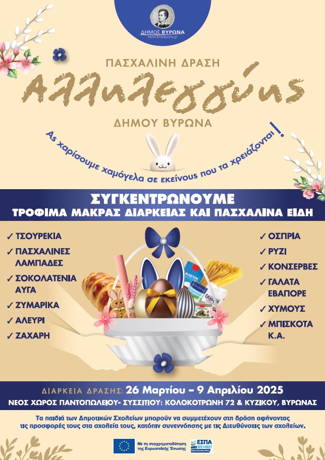 Ο Δήμος Βύρωνα, σε συνεργασία με τις Δομές Παροχής Βασικών Αναγκών: Κοινωνικό Παντοπωλείο & Συσσίτιο, της Διεύθυνσης Κοινωνικής Πολιτικής & Υγείας, οργανώνει δράση αλληλεγγύης για την ενίσχυση των οικογενειών που βρίσκονται σε ανάγκη εν όψει των εορτών του Πάσχα. Η δράση στοχεύει στο να προσφέρει ένα ευχάριστο και γεμάτο ελπίδα Πάσχα στις ευάλωτες οικογένειες του Δήμου μας, καλώντας τους συμπολίτες μας να συνεισφέρουν με τρόφιμα μακράς διάρκειας και πασχαλινά είδη.