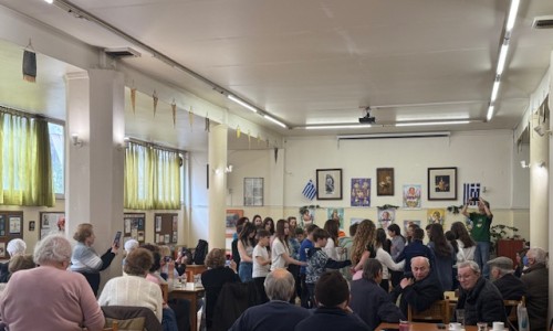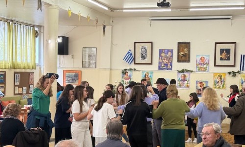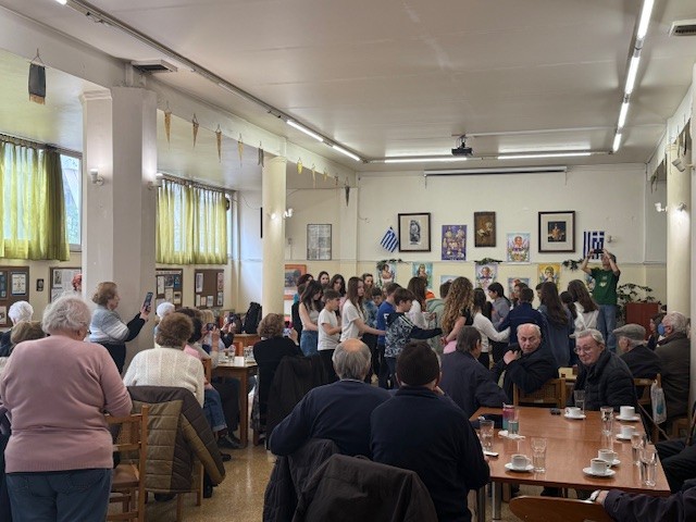 Στη συνέχεια, τραγούδησαν με ενθουσιασμό και σεβασμό το «Ξύπνα, καημένε μου Ραγιά», γεμίζοντας τον χώρο με τα νοήματα της ελευθερίας και του αγώνα.