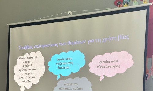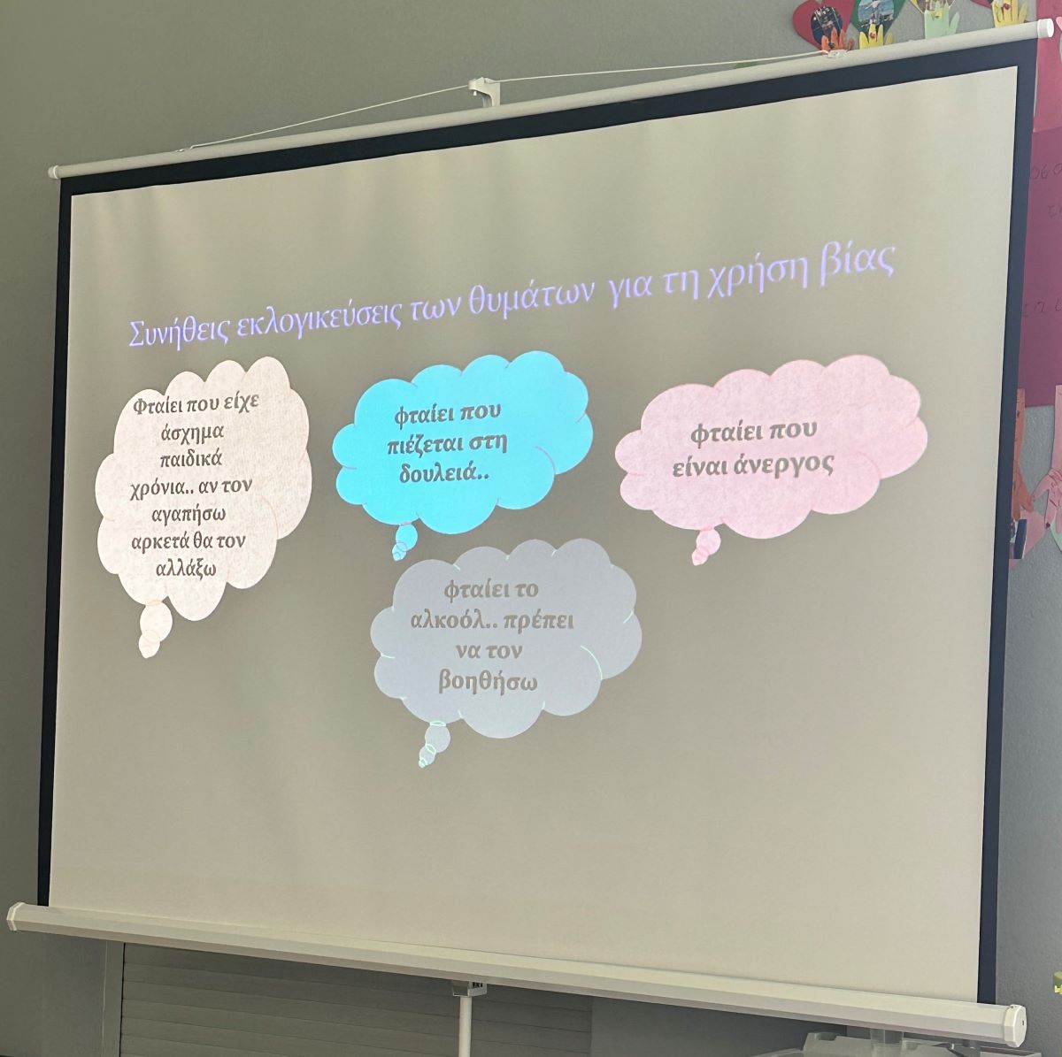 Οι εισηγήτριες Έλενα Αποστολίδου, κοινωνιολόγος MSc, σύμβουλος στο Συμβουλευτικό Κέντρο για Γυναίκες Θύματα Βίας Αθήνας και Ευφροσύνη Σπανέα, κλινική ψυχολόγος PhD, σύμβουλος στο Συμβουλευτικό Κέντρο για Γυναίκες Θύματα Βίας Αθήνας περιέγραψαν την καθημερινότητα που αντιμετωπίζουν καθημερινά από τα περιστατικά που αναλαμβάνουν, καθοδήγησαν στην αναγνώριση των ενδείξεων ενδοοικογενειακής βίας και ενημέρωσαν για το νομικό πλαίσιο που ισχύει.