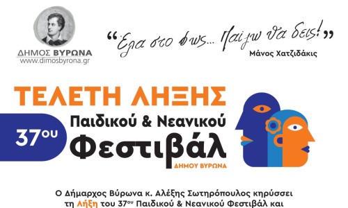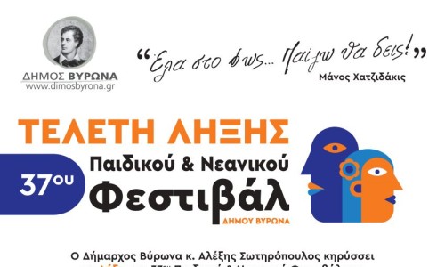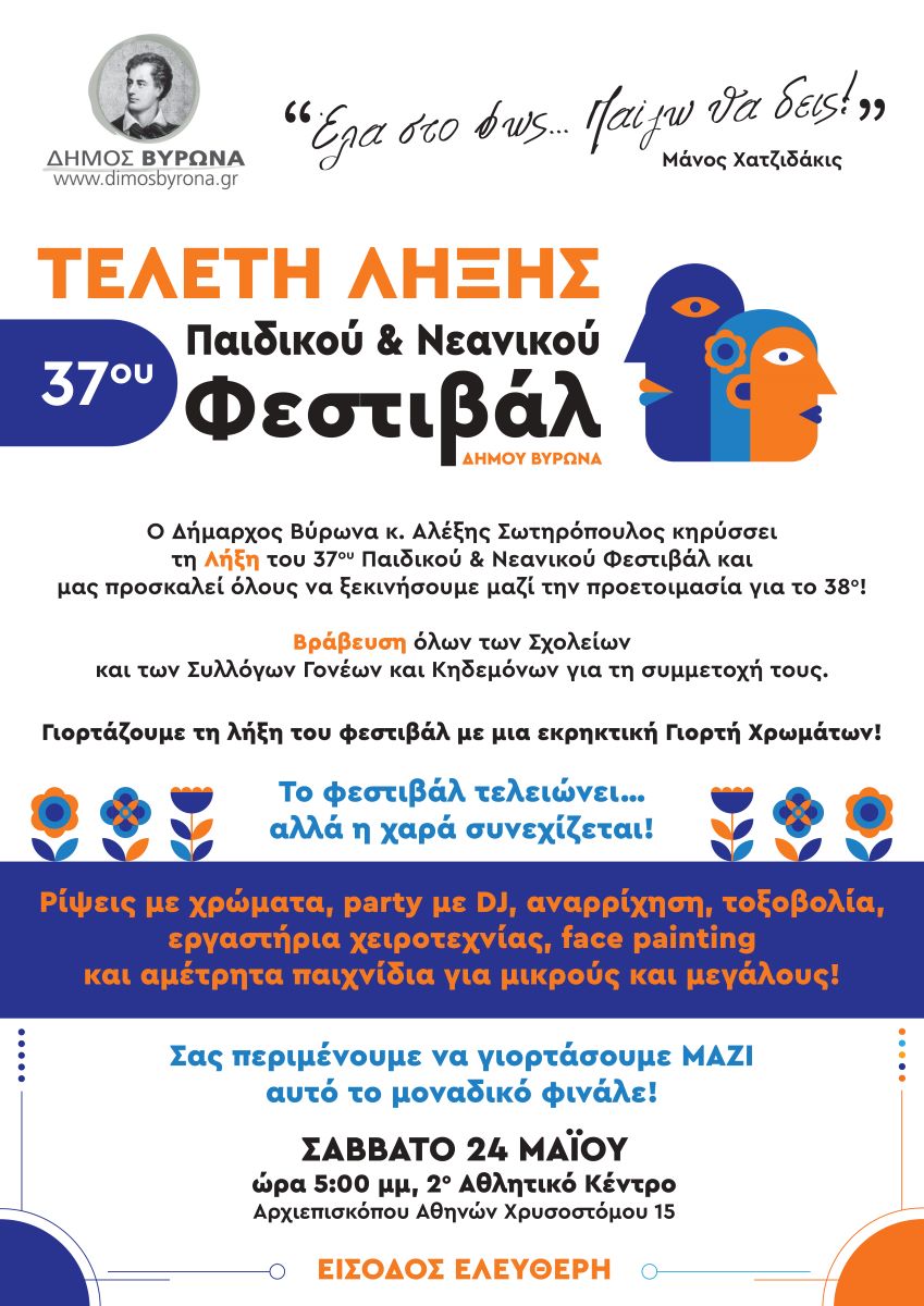 Ο Δήμος Βύρωνα σας προσκαλεί να γιορτάσουμε τη λήξη του 37ου Παιδικού Νεανικού -Φεστιβάλ σε μια μεγάλη, πολύχρωμη γιορτή για μικρούς και μεγάλους, στις 24 Μαΐου 2025 και ώρα 17.00 στο 2ο Αθλητικό Κέντρο (Αρχιεπισκόπου Αθηνών Χρυσοστόμου 15), ολοκληρώνοντας έτσι το φετινό Φεστιβάλ με τίτλο «Έλα στο φως…Παίζω θα δεις», που μας προσέφερε δύο εβδομάδες γεμάτες δημιουργία, παιχνίδι και πολιτισμό.