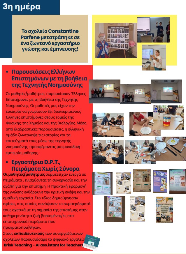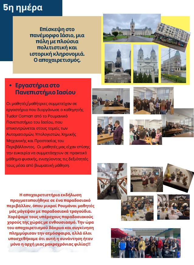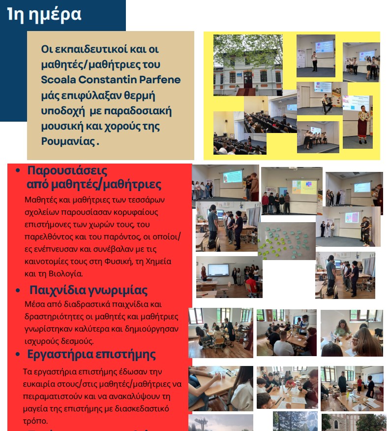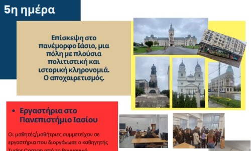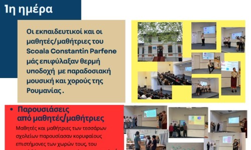Στο πλαίσιο του προγράμματος Erasmus+ Digital Powered Τeaching, ομάδα μαθητών και εκπαιδευτικών του 1ου Γυμνασίου Βύρωνα συμμετείχε στην 4η κινητικότητα στο Βασλούι της Ρουμανίας, στο συνεργαζόμενο σχολείο @Scoala Constantin Parfene, με ακόμα δύο συνεργαζόμενα σχολεία, της Κροατίας και της Κύπρου.