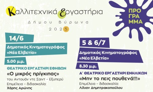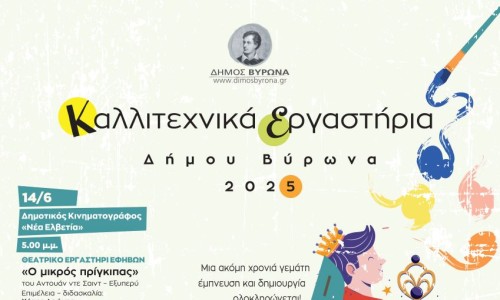 Μετά από μια ακόμη γεμάτη έμπνευση χρονιά, τα Καλλιτεχνικά Εργαστήρια του Δήμου Βύρωνα ολοκληρώνουν τον κύκλο τους με έναν πλούσιο καλλιτεχνικό απολογισμό. Το κοινό καλείται να παρακολουθήσει τις τελικές παρουσιάσεις των τμημάτων θεάτρου, μουσικής και ζωγραφικής, σε μια γιορτή δημιουργίας που αναδεικνύει το ταλέντο και την προσπάθεια των συμμετεχόντων.