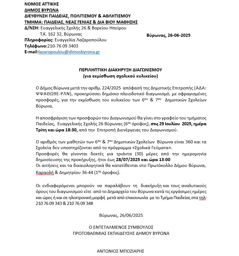 Προκήρυξη πλειοδοτικού διαγωνισμού εκμίσθωσης Κυλικείου των 6ου - 7ου Δημοτικών Σχολείων Βύρωνα