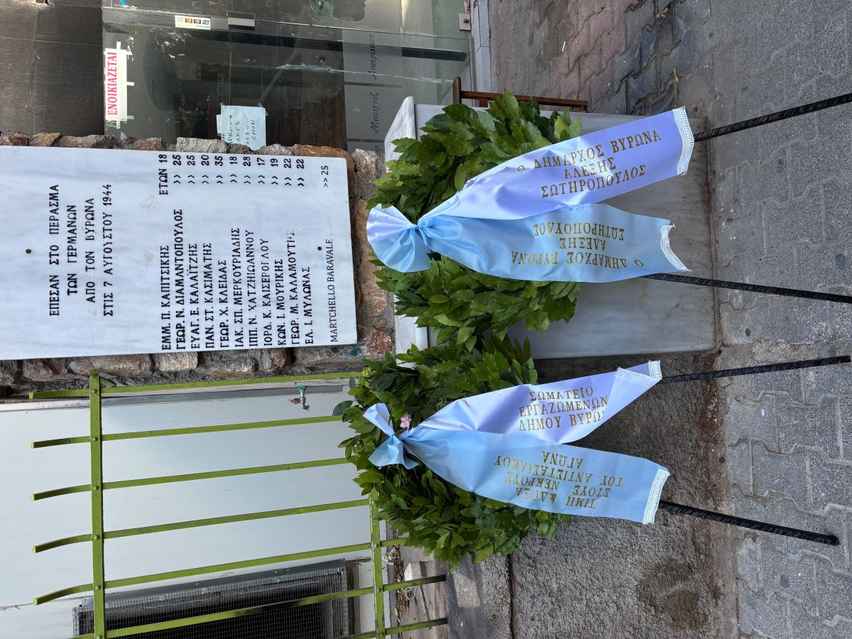 Μετά την επιμνημόσυνη δέηση, ο Δήμαρχος Βύρωνα, Αλέξης Σωτηρόπουλος, κατέθεσε στεφάνι στο σημείο της εκτέλεσης όπως και το Σωματείο Εργαζόμενων Βύρωνα μπροστά στον τοίχο του παλιού παιδικού σταθμού «Μοργκεντάου» — σημερινό χώρο των 5ου και 6ου Δημοτικών Παιδικών Σταθμών στην οδό Χρυσοστόμου Σμύρνης.