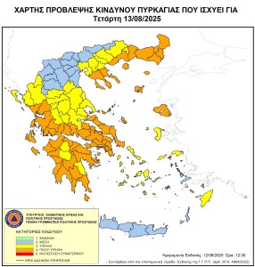 Αυξημένος Κίνδυνος Πυρκαγιάς (κατηγορίας 4) και την Τετάρτη 13 Αυγούστου 2025