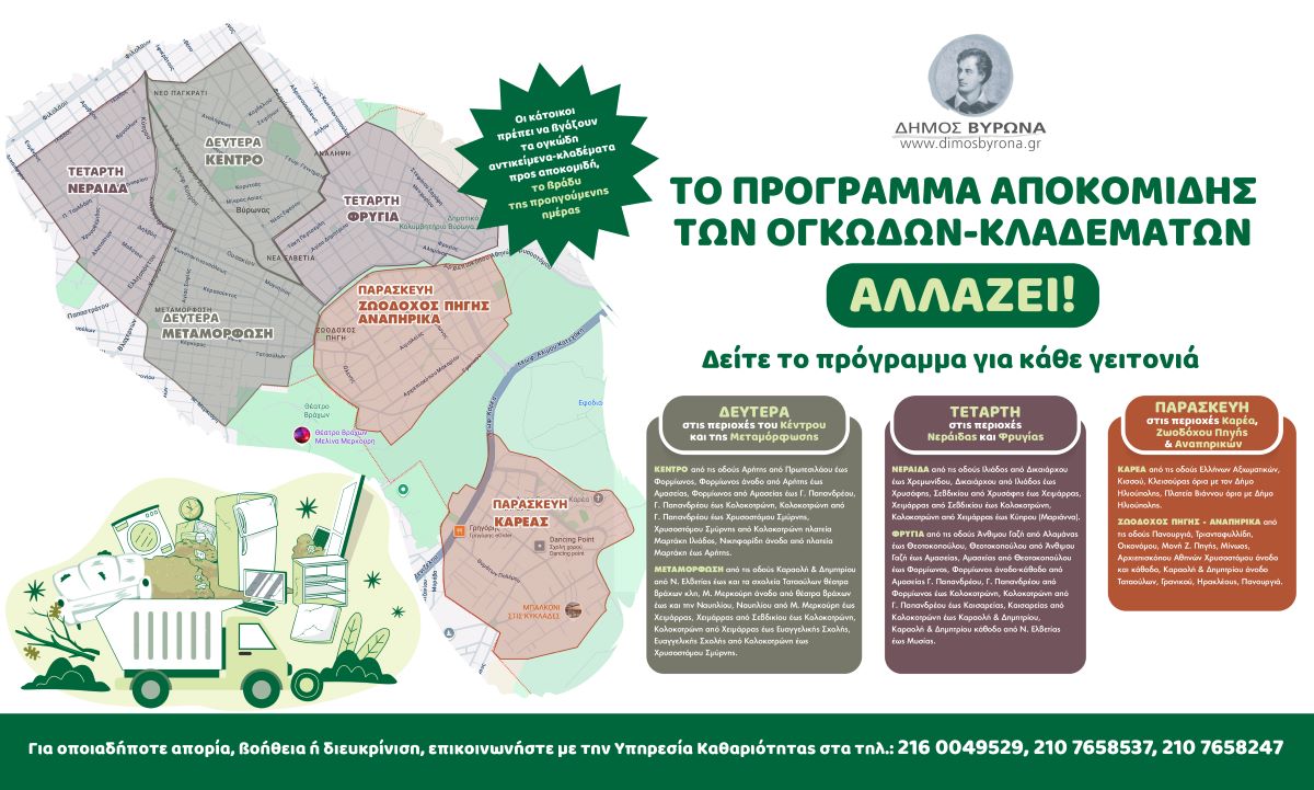 Από Δευτέρα 22 Σεπτεμβρίου, για την βελτίωση της καθαριότητας και της εικόνας της πόλης μας, η αποκομιδή ογκωδών αντικειμένων και κλαδεμάτων θα πραγματοποιείται την ίδια μέρα, κάθε εβδομάδα, σε κάθε γειτονιά, σύμφωνα με το ακόλουθο πρόγραμμα: