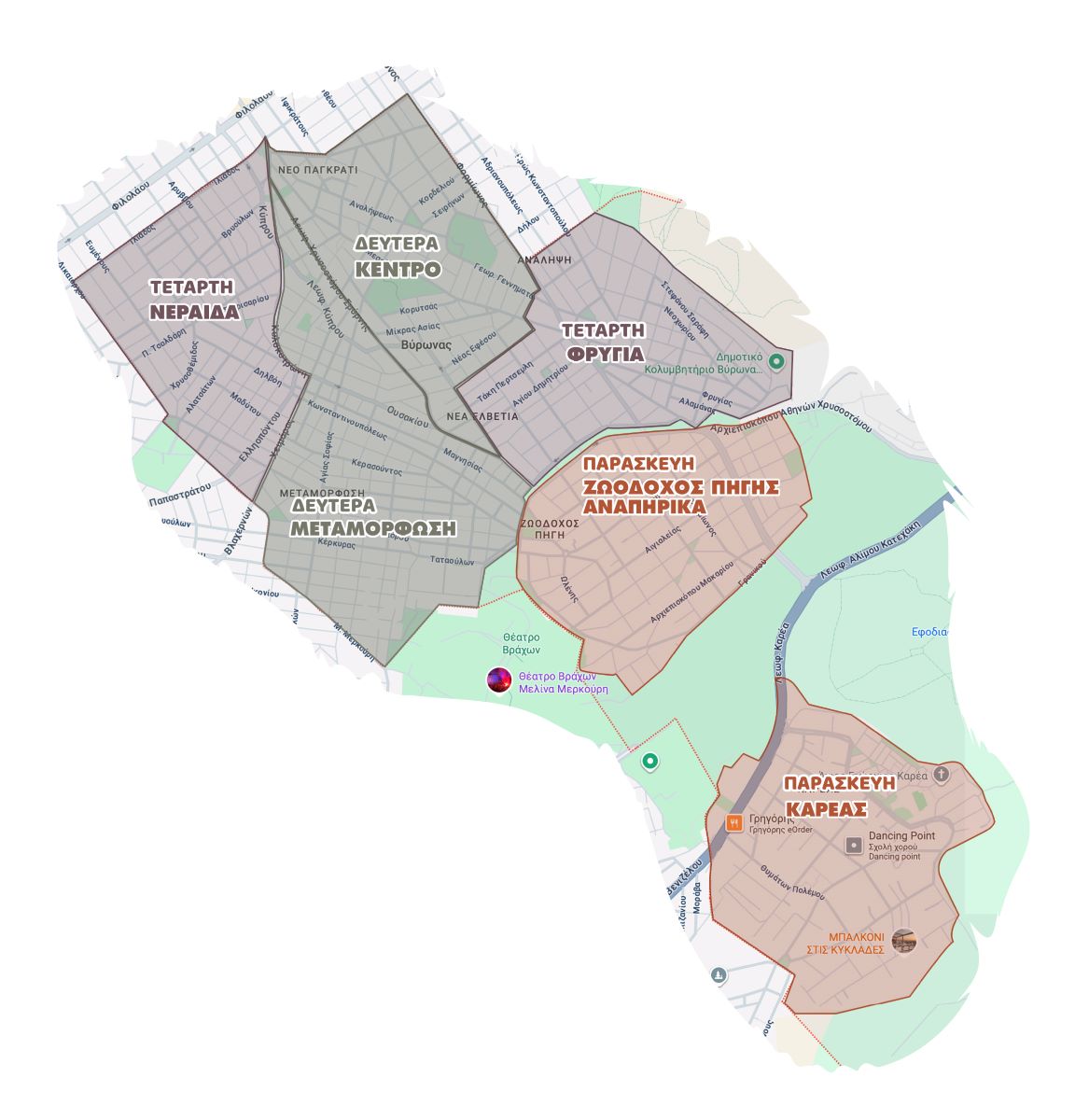 ·της Ζωοδόχου Πηγής και των Αναπηρικών που περικλείεται από τις οδούς Πανουργιά, Τριανταφυλλίδη, Οικονόμου, Μονή Ζωοδόχου Πηγής, Μίνωος, Αρχιεπισκόπου Αθηνών Χρυσοστόμου άνοδο και κάθοδο, Καραολή & Δημητρίου άνοδο Ταταούλων, Γρανικού, Ηρακλέους, Πανουργιά