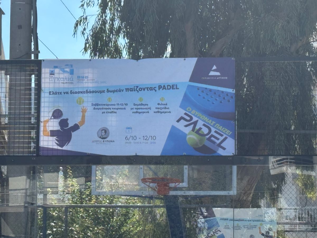 Ο Δήμος Βύρωνα, σε συνεργασία με την Περιφέρεια Αττικής, διοργάνωσε από τις 6 έως τις 12 Οκτωβρίου την αθλητική δράση «Ο ΒΥΡΩΝΑΣ ΠΑΙΖΕΙ PADEL», με στόχο τη γνωριμία των δημοτών – και κυρίως των παιδιών – με το ανερχόμενο άθλημα του Padel.