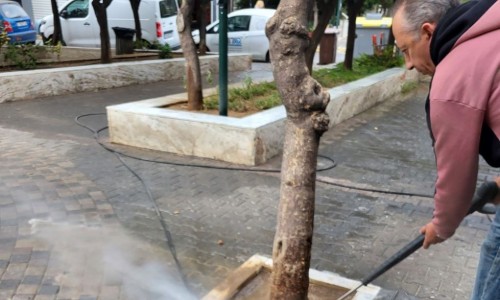 Οι καθαρισμοί πραγματοποιήθηκαν με τη χρήση του πιεστικού μηχανήματος, το οποίο λειτούργησε ξανά μετά από μεγάλο χρονικό διάστημα αδράνειας. Το μηχάνημα χρησιμοποιεί υψηλή πίεση κρύου ή ζεστού νερού (έως 500 bar και 98°C), καθώς και ατμό, αποτελώντας την ιδανική επιλογή για καθαρισμό και απολύμανση χωρίς τη χρήση χημικών καθαριστικών. Είναι κατάλληλο για κοινόχρηστους χώρους, όπως πλατείες, πεζοδρόμια και άλλες επιφάνειες.