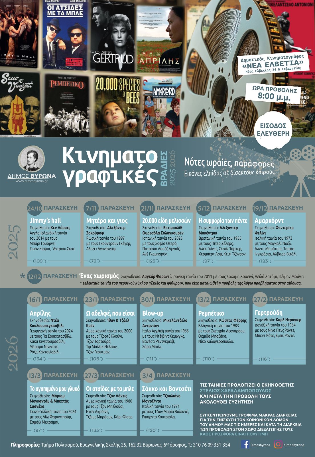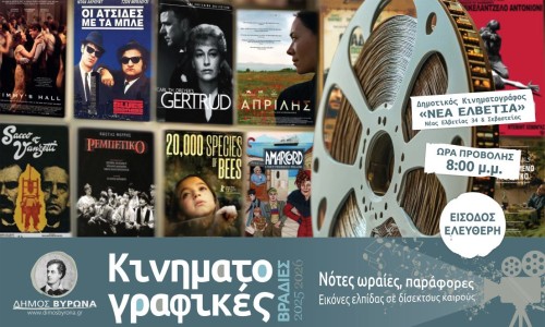 Στις 24 Οκτωβρίου αρχίζουν και πάλι οι Κινηματογραφικές Βραδιές του Δήμου Βύρωνα, στον Δημοτικό Κινηματογράφο «Νέα Ελβετία» (Νέας Ελβετίας 34 & Σεβαστείας), Ώρα Προβολής 8.00 μ.μ., Είσοδος Ελεύθερη.