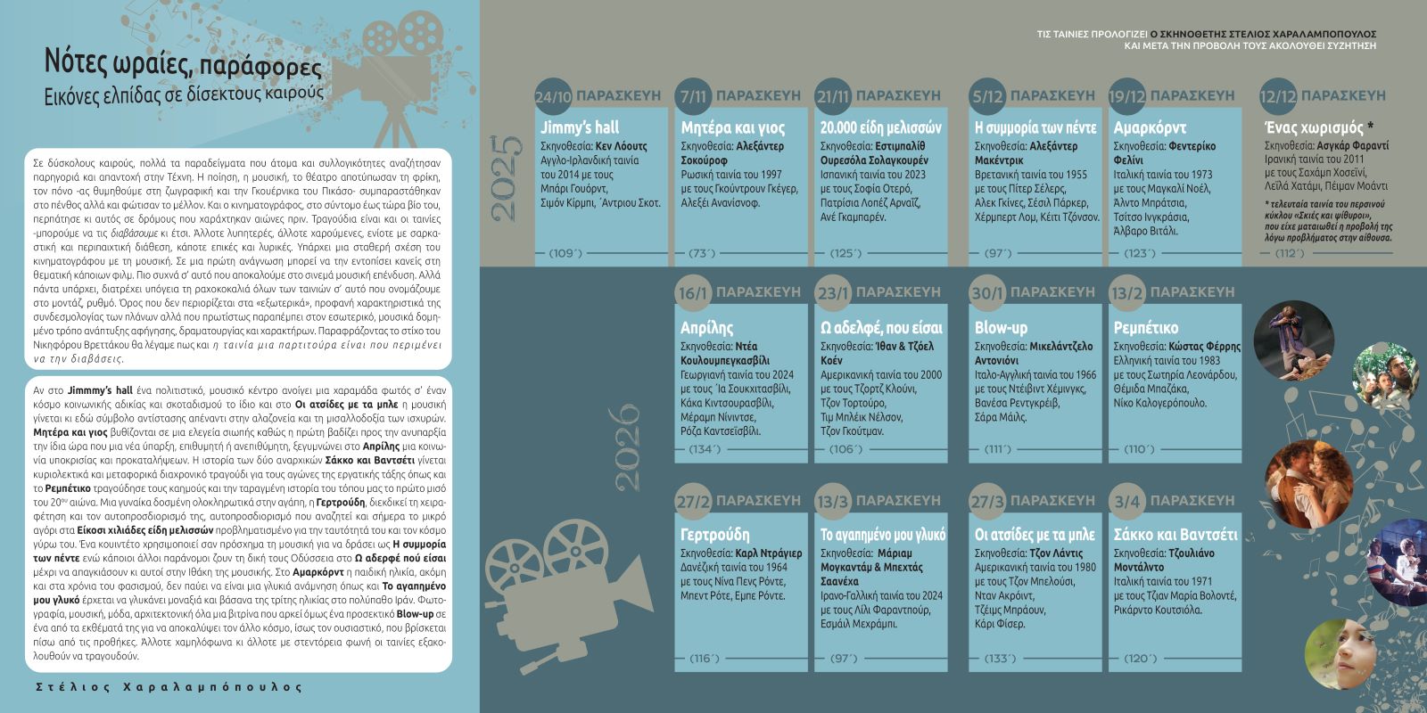 · Την Παρασκευή 12/12/2025 θα παιχθεί το Ένας χωρισμός του Ασγκάρ Φαραντί, τελευταία ταινία του περσινού κύκλου Σκιές και ψίθυροι, που είχε ματαιωθεί η προβολή της λόγω προβλήματος στην αίθουσα.