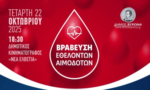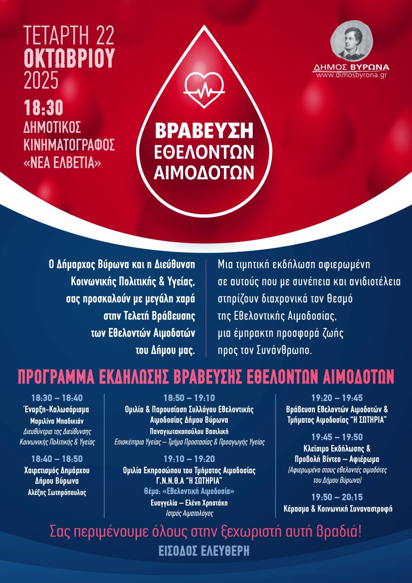 Ο Δήμος Βύρωνα διοργανώνει τιμητική εκδήλωση αφιερωμένη στους Εθελοντές Αιμοδότες που με συνέπεια και ανιδιοτέλεια στηρίζουν διαχρονικά τον θεσμό της Εθελοντικής Αιμοδοσίας.