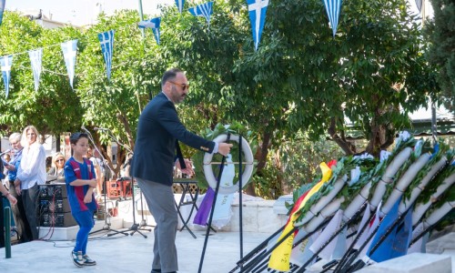 Και θέλω απευθυνόμενος στην νεολαία που θα παρελάσει σε λίγο υπερήφανα ενώπιον μας να τους πω ότι : Εσείς είστε το μέλλον αυτού του τόπου και πρέπει να θυμάστε ότι τα ιδανικά του ’40 δεν ανήκουν στο παρελθόν. Ζουν κάθε φορά που κάποιος στέκεται όρθιος απέναντι στο άδικο, κάθε φορά που υπερασπίζεται την αλήθεια, κάθε φορά που παλεύει για το κοινό καλό, για την ειρήνη, για την ελπίδα. Η ιστορία δεν ζητά από εμάς να γίνουμε ήρωες του βουνού, αλλά να γίνουμε ήρωες της καθημερινότητας — με ήθος, με ευθύνη, με συμμετοχή, με σεβασμό στον διπλανό μας, την ελευθερία, την δικαιοσύνη και τη δημοκρατία.