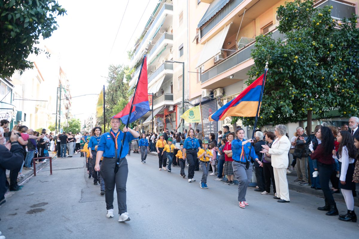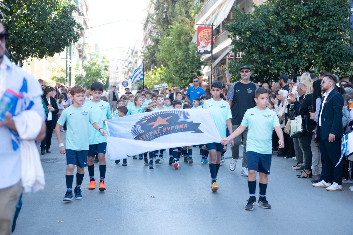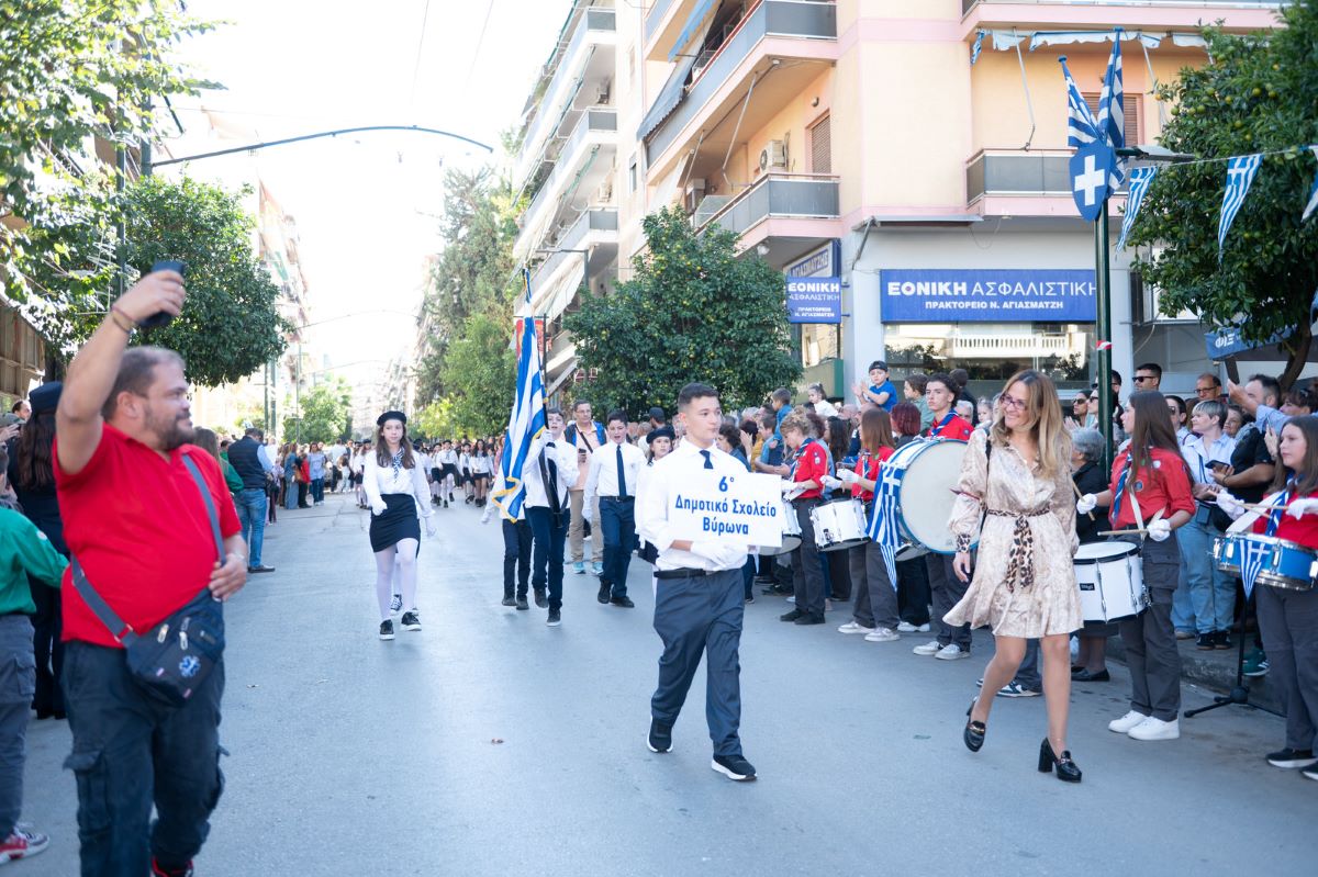 Στη συνέχεια, ο Δήμαρχος Βύρωνα, εκφώνησε τον πανηγυρικό της ημέρας και ακολούθησε η καθιερωμένη παρέλαση μαθητών, πολιτιστικών και αθλητικών συλλόγων της πόλης μας, στην οδό Χρυσοστόμου Σμύρνης.