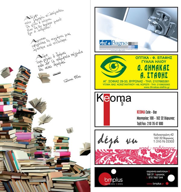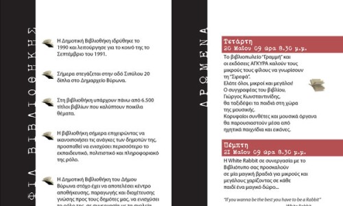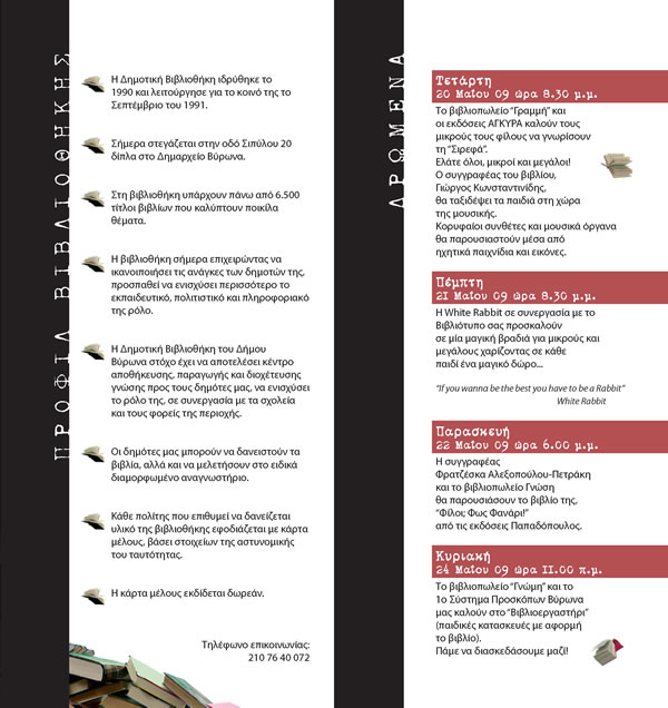 Η συνεργασία των βιβλιοπωλών του Δήμου μας και της Δημοτικής Βιβλιοθήκης σηματοδοτούν για έκτη χρονιά τα δρώμενα πολιτισμού στην πόλη μας. Σας περιμένουμε όλους να γνωρίσουμε ό,τι καλύτερο έχει η αγορά στο χώρο του βιβλίου αλλά και να διασκεδάσουν τα παιδιά μας με ευχάριστες εκπλήξεις και δραστηριότητες.