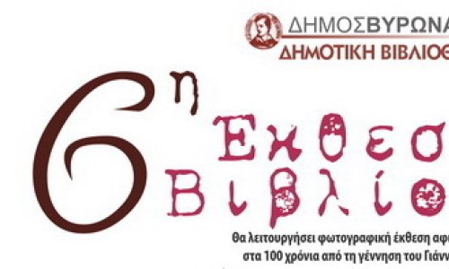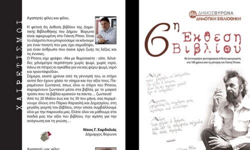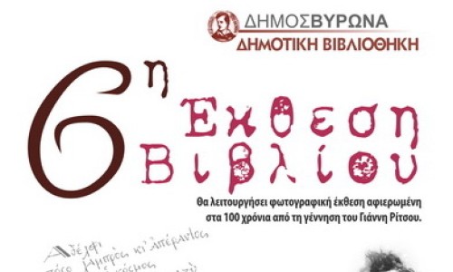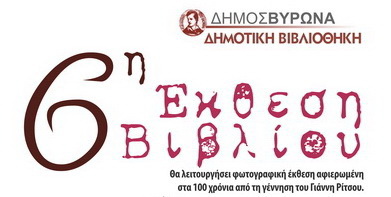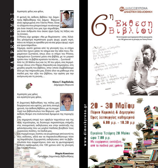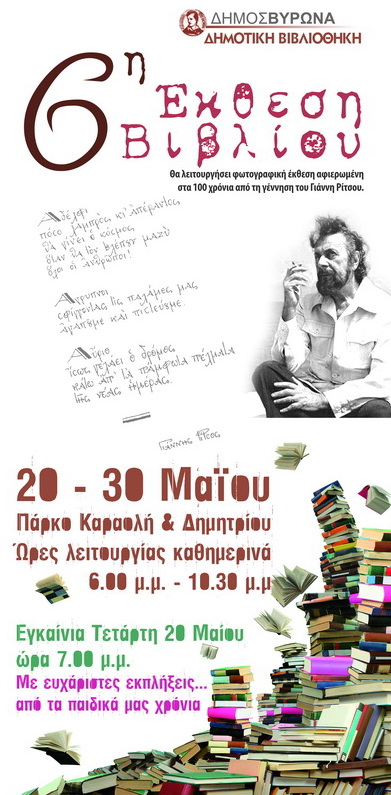 Αφιερωμένη στα 100 χρόνια από τη γέννηση του Γιάννη Ρίτσου, είναι η 6η Έκθεση Βιβλίου που διοργανώνει η Δημοτική Βιβλιοθήκη του Δήμου Βύρωνα, από τις 20 έως και τις 30 Μαίου 2009, στο πάρκο της Καραολή & Δημητρίου. Η έκθεση θα λειτουργεί από τις 18.00 το απόγευμα έως και τις 22.30 το βράδυ.