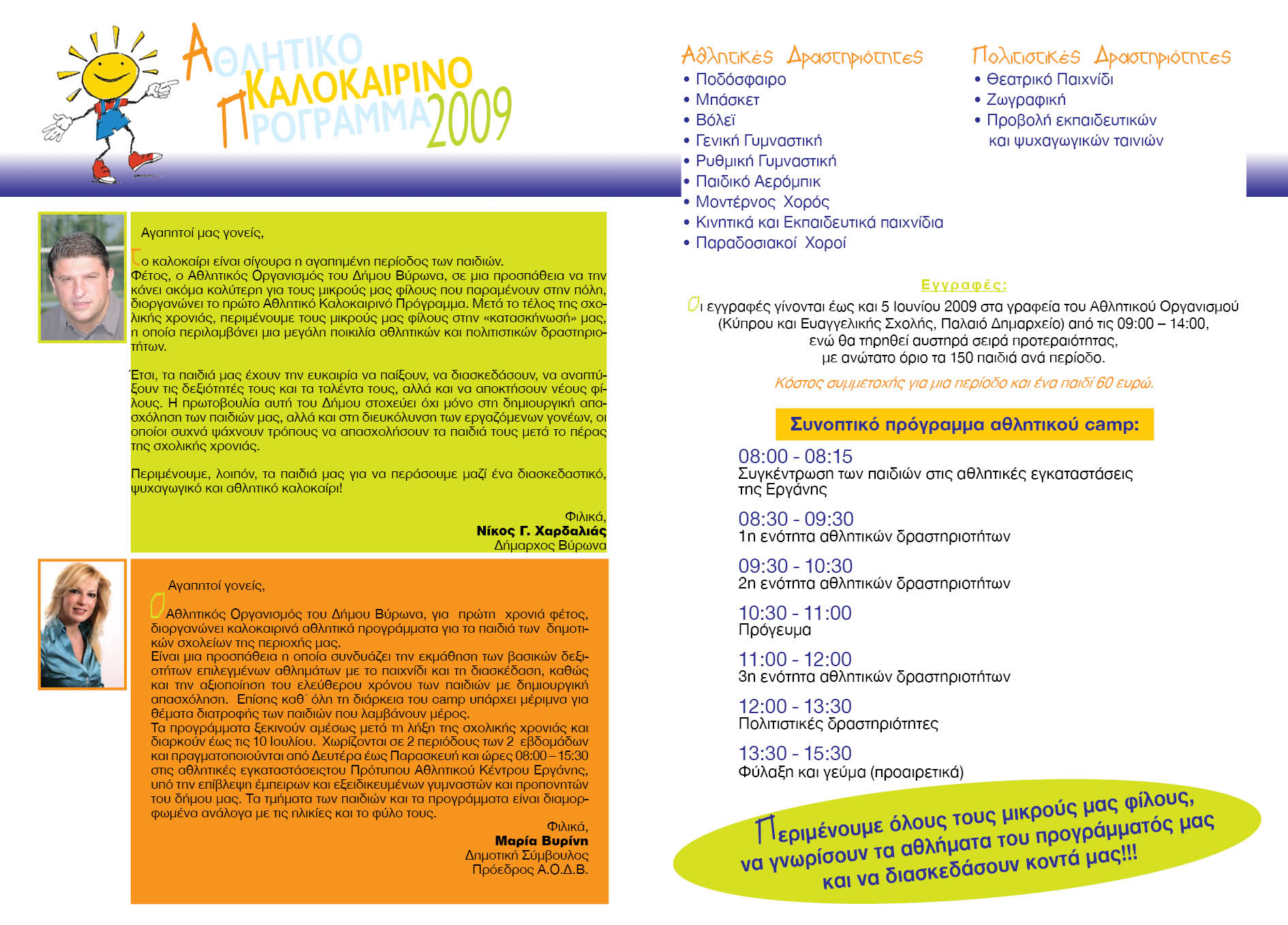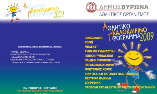 Ο Αθλητικός Οργανισμός του Δήμου Βύρωνα οργανώνει φέτος, για πρώτη φορά, το Αθλητικό Καλοκαιρινό Πρόγραμμα. Το πρόγραμμα απευθύνεται σε μαθητές δημοτικού και προσφέρει μεγάλη ποικιλία αθλητικών και πολιτιστικών δραστηριοτήτων. Στόχος του προγράμματος είναι να ανταποκριθεί σε ένα συχνό πρόβλημα των εργαζόμενων γονέων, αυτό της φύλαξης των παιδιών κατά τις ώρες εργασίας μετά το τέλος της σχολικής χρονιάς. Έτσι, το πρόγραμμα δίνει τη δυνατότητα στους μαθητές να διασκεδάσουν, να αναπτύξουν τα ταλέντα τους, αλλά και να κάνουν νέους φίλους, πάντα με την επίβλεψη εξειδικευμένου προσωπικού.Εγγραφές πραγματοποιούνται εώς και τις 5 Ιουνίου.