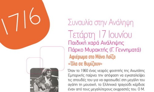 Μία άλλη αγαπημένη πλατεία θα επισκεφτούμε απόψε το βράδυ, Τετάρτη 17 Ιουνίου, στην παιδική χαρά της Ανάληψης, στο πάρκο της Μυρακτής, με το αφιέρωμα στο Μάνο Λοϊζο. Απόψε, λίγο μετά τις 20.30, τραγουδάμε το "Όλα σε θυμίζουν" με τη συμμετοχή της Αργυρώς Καπαρού, της Αθηνάς Ρούτση και του Φώτη Θεοδωρίδη. Την επιμέλεια του προγράμματος και τις ενορχηστρώσεις έχει κάνει ο Γιάννης Παπαζαχαριάκης. Ο Μάνος Λοϊζος τραγούδησε την αγάπη, τον έρωτα, το θάνατο. Αυτό θα κάνουμε απόψε κι εμείς...Χθες, η πλατεία Σμύρνης γέμισε φανατικούς θαυμαστές της Ελεονόρας Ζουγανέλη, που όλη τη χρονιά κέρδιζε την αγάπη μας με τις επιλογές της. Ο κόσμος από νωρίς κατέκλεισε την πλατεία και όλοι οι Βυρωνιώτες συμμετείχαν σε ένα μεγάλο πανηγύρι τραγουδιών και χορού δείχνοντας με τον καλύτερο τρόπο την αποδοχή τους στις εκδηλώσεις που διοργανώνει το Πνευματικό Κέντρο του Δήμου Βύρωνα!