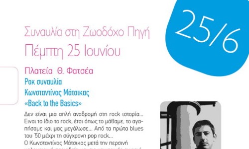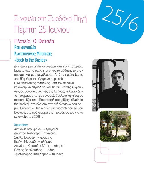 Στην πλατεία Φατσέα είναι σήμερα Πέμπτη 25 Ιουνίου στις 20:30 το βράδυ, το ραντεβού των Βυρωνιωτών για τη ροκ συναυλία του Κωνσταντίνου Μάτσικα, στο πλαίσιο των εκδηλώσεων του Πνευματικού Κέντρου "Όλη η πόλη μια γιορτή".Το ροκ που αγαπάμε, το ροκ που μαζί του μεγαλώσαμε. Ο Κωνσταντίνος Μάτσικας μαζί με 7μελή ορχήστρα, έρχονται να ξεσηκώσουν το Βύρωνα με την "Επιστροφή στις ρίζες".